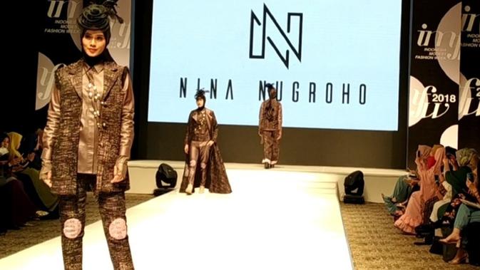 Liputan6.com, Jakarta - Memadukan gaya klasik dan modern pada busana kerja dengan tema Rendezvous, desainer busana muslim, Nina Nugroho menampilkan 10 koleksi terbarunya di ajang Indonesia Modest Fashion Week (IMFW) 2018. Ia menggunakan bahan-bahan acrylic wool yang berserat, dipadukan dengan bahan faux leather berlapis satin yang lembut dan batik Cirebon bermotif wayang.