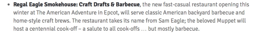 Regal Eagle Smokehouse: Craft Drafts & Barbecue at EPCOT To Be Hosted by Sam Eagle of The Muppets - wdwnt.com