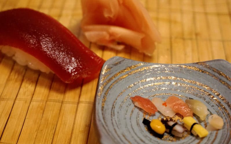 マグロの赤身に中トロ、カレイ、ホッキ貝。ウニ、タコ、たまごにガリを添える。しっかり7貫、一人前の寿司(すし)だが、おなかいっぱいになるのは難しい。すべて一粒のシャリで握った「一粒寿司」だからだ。