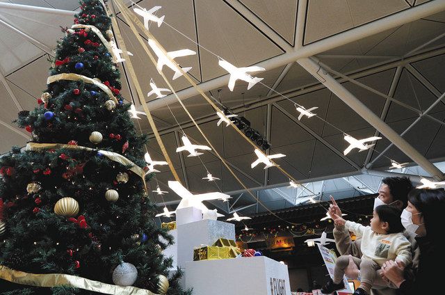 「フライトクリスマス2021」と題し、空港会社が空の旅に興味を持ってもらおうと企画。飛行機型のクラフト照明は、...