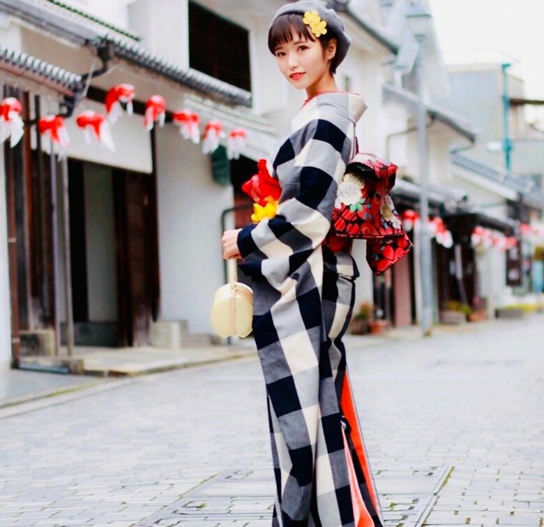 色鮮やな振袖のイメージとは違い、白と黒とグレーのシンプルな“格子模様”で素敵な振袖だ。